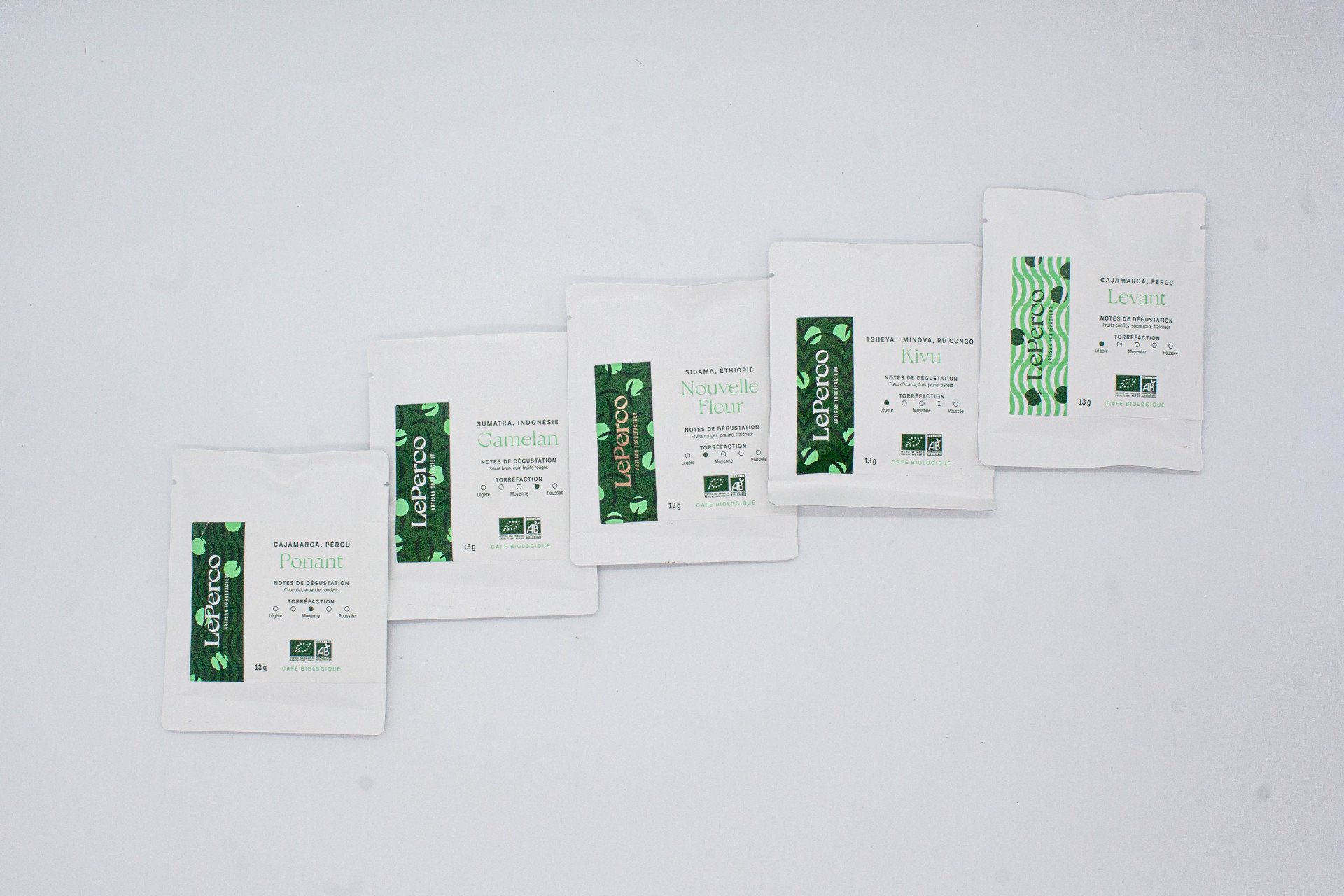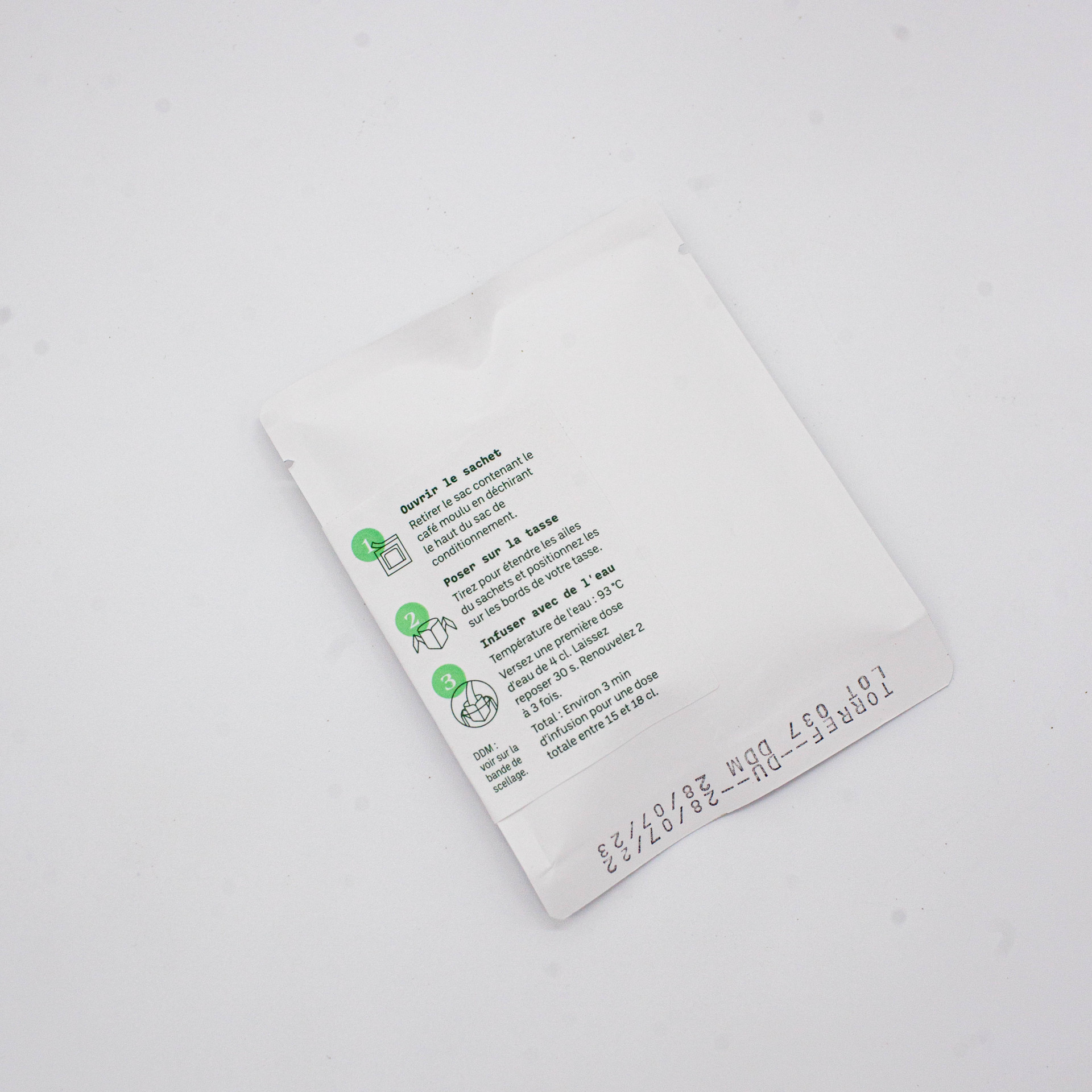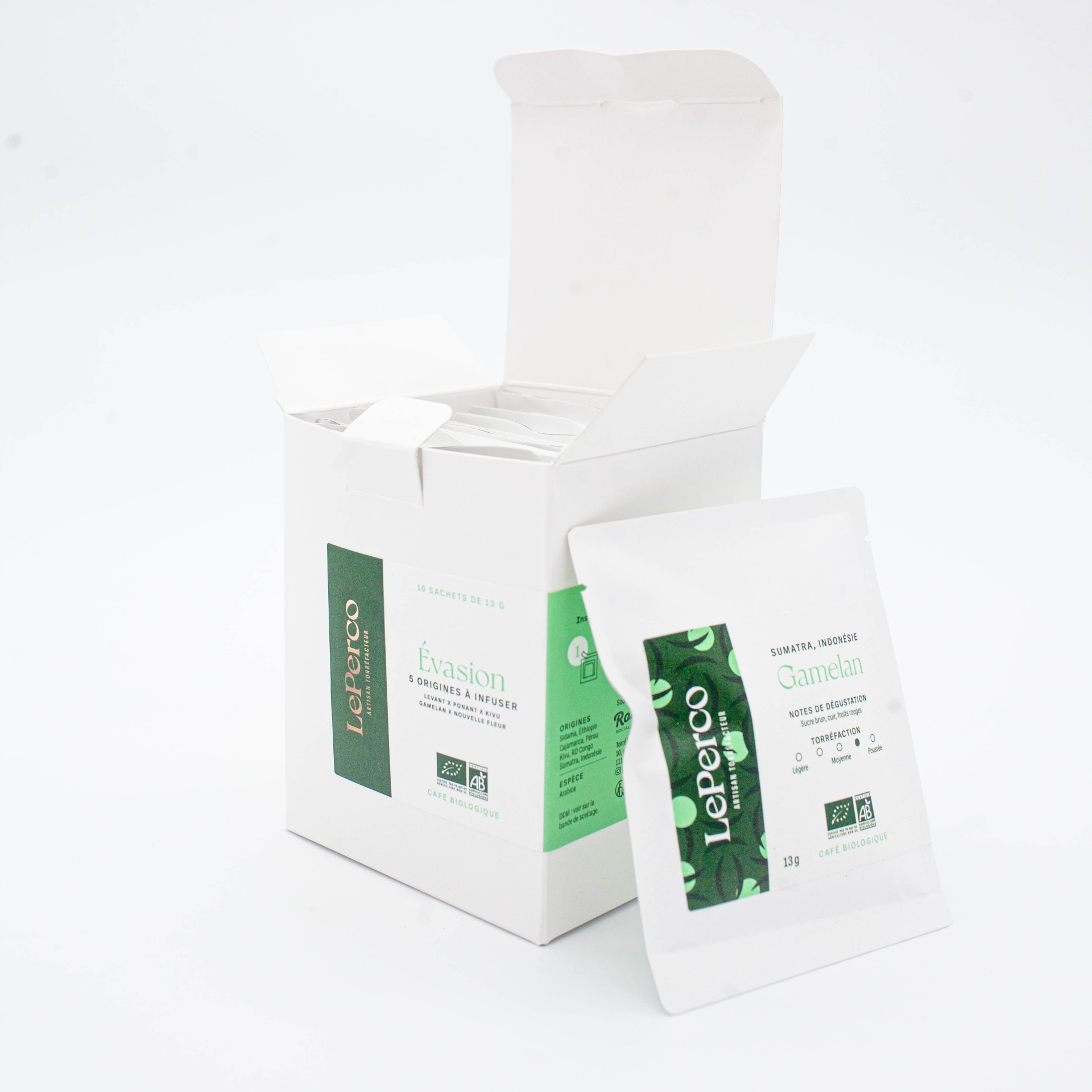 Dans cette boîte vous trouverez 10 sachets avec 5 de nos origines prêtes à être filtrées ou infusées dans votre tasse de voyage.